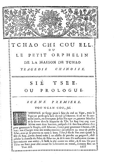 大文豪伏爾泰(Voltaire,1694-1778)在他根據(jù)《趙氏孤兒》改編而成的《中國孤兒》(L’O rphelin de la Chine)的《獻(xiàn)詞》(Epitre)中這樣評價這篇譯文:“《趙氏孤兒》是一部珍貴的大作,它使人了解中國精神,勝過人們已經(jīng)做過的以及將來要做的關(guān)于這個大帝國所有之陳述。”在18世紀(jì)“啟蒙運動”的時代,《趙氏孤兒》在西方首次彰顯了中國人與黑暗勢力堅決斗爭,為正義事業(yè)前仆后繼的英勇形象,第一次在海外奏出了中國人的強音。