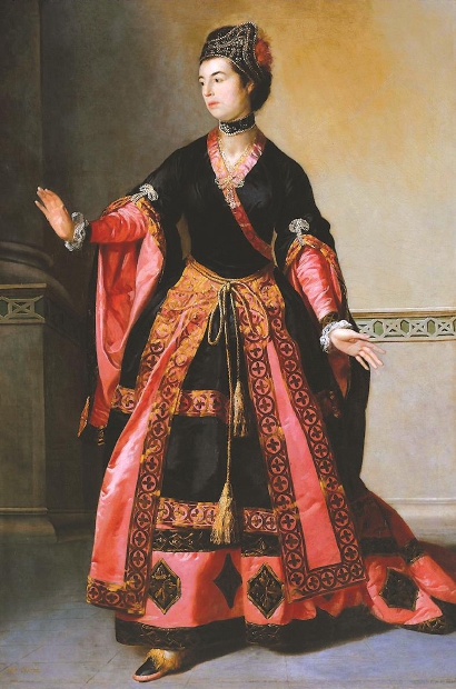 愛爾蘭劇作家阿瑟·墨菲(Arthur Murphy)被馬若瑟翻譯的《趙氏孤兒》所吸引,參考伏爾泰的《中國孤兒》,創(chuàng)作了他的戲劇作品《中國孤兒》,圖為劇中勇敢的女性曼丹(Mandane)戲劇舞臺造型,由瑪麗安·葉慈太太(Mary Ann Yates)扮演