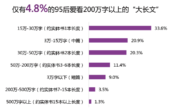 其次,輕量化的“小長文”漸成網(wǎng)絡(luò)文學(xué)主流。相比于紙質(zhì)文學(xué),網(wǎng)絡(luò)文學(xué)的一個突出特點(diǎn)便是“長”,曾幾何時,路遙長篇小說《平凡的世界》百萬字的篇幅已令很多 讀者望而生畏,然而如果將其放到網(wǎng)絡(luò)文學(xué) 領(lǐng)域,100 萬字或許只能算是“短篇”。其實(shí),網(wǎng)絡(luò)文學(xué)的早期形態(tài)并不長,例如被譽(yù)為網(wǎng)文開山之作的《第一次親密接觸》(痞子蔡),其總長也不過 50 余萬??梢姡W(wǎng)文字?jǐn)?shù)的長并不是“先天”的,從某種意義上說,它在很大程度上是由于資本的介入與網(wǎng)絡(luò)作家分成方式而導(dǎo)致的“注水”。那么,網(wǎng)文會持續(xù)“長”下去嗎?答案可能是否定 的,據(jù)統(tǒng)計(見圖 3),實(shí)際上僅有不足 5% 的Z世代人群愛看200萬字以上的“大長文”, 而相比之下,15—30 萬字的“小長文”成 為了“95 后”的最愛。顯然,“小長文”因 體量上的“輕”而更加適應(yīng)年輕人細(xì)碎、零散的閱讀時間,當(dāng)小長文迎合了 Z 世代的閱讀偏好,大長文一家獨(dú)大的地位便會漸漸喪失,輕量化的網(wǎng)絡(luò)文學(xué)成為主流之日便已然不遠(yuǎn)。