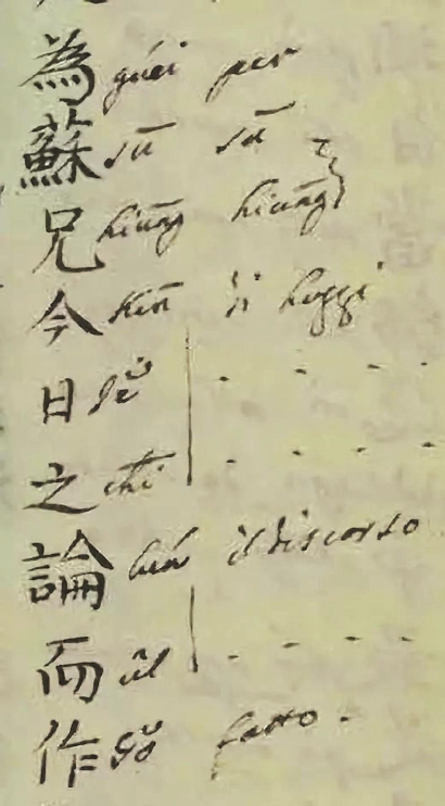 作者幫助讀者識(shí)字的意圖十分明顯。試舉幾例:中文“太?!薄案笔埂钡裙俾殻髡咴谧⒁艉缶g為“官員”(mandarino)?!凹卓铺U洹北蛔g為“官銜”(nome di mandarinano)。“人家”譯作“人”(huomino)和“家”(case)。為幫助不通意大利文的讀者有真切的感受,請(qǐng)?jiān)试S我把這兩個(gè)意大利文名詞轉(zhuǎn)譯英文,前者是human,后者是house。human加house是漢語“人家”的意思嗎?還有更可樂的,“尚未聯(lián)姻”中的“尚未”被譯作“上面”(supra)和“不”(non)。常老師說:“萬濟(jì)國的語言能力令人嘆服,他不但能夠熟練使用漢語,而且還用西班牙語編寫了漢語教材《華語官話語法》”,這樣一位能人絕不可能不懂“人家”和“尚未”這兩個(gè)詞的含義,之所以逐字注解,他的用意顯然是幫助讀者識(shí)字,而不是請(qǐng)他們讀小說。最后再舉一個(gè)堪稱較好的完整句子“為蘇兄今日之論而作”,譯文是:per(為)Su(蘇)兄(hiung)今 日(di hoggi)論(il discorso)作(fatto)。這里的意大利文根本不是一個(gè)句子,連猜帶蒙固然還能猜出一點(diǎn)意思來。然而,這種文字能說是在翻譯一篇小說嗎?況且,《玉嬌梨》共有二十回,而見諸此件的僅有兩千余字,不足一回,相差太大。