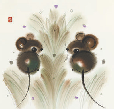 在他筆下,花叢里、綠蔭下,一窩窩、一簇簇生肖鼠,蹦跳著、斜躺著、依偎著,胡子翹著,小尾巴滴溜溜亂轉(zhuǎn),個(gè)個(gè)眉飛色舞,心滿(mǎn)意足。韓美林曾一口氣畫(huà)了700多幅可供選擇的稿樣。