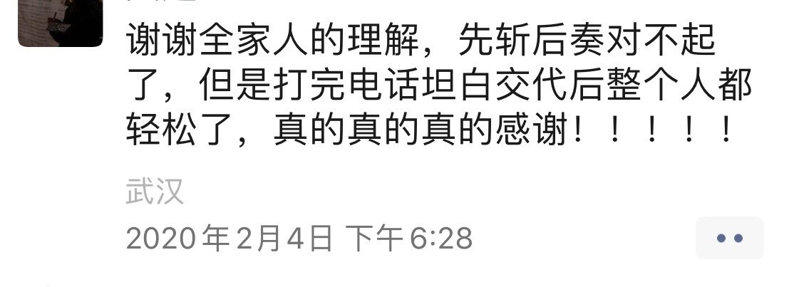 掛斷電話,越越心里松了一口氣,她打開朋友圈,定位到“武漢”,發(fā)了一條文字狀態(tài),向家人的理解表示感謝,也給自己接下來這場(chǎng)未知的戰(zhàn)“疫”打氣。