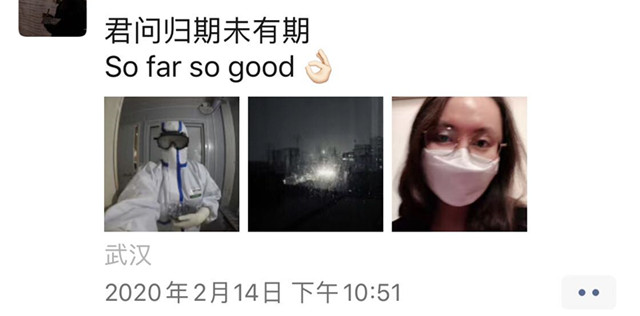 2月14日,越越又發(fā)了一條定位在“武漢”的朋友圈:“君問歸期未有期,so far so good.”照片中戴著口罩的越越難以掩蓋倦容,雨雪交加的武漢在黑夜中仍點(diǎn)亮著希望的明燈。