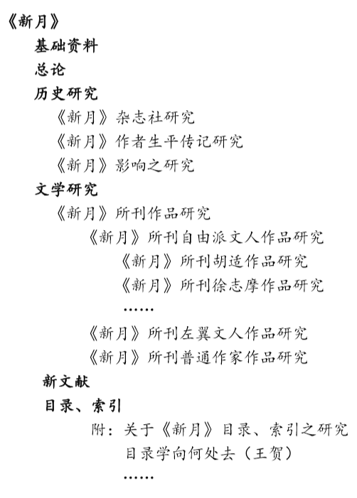 不過,為了討論的方便,這里仍不妨舉一個(gè)與《新月》雜志有關(guān)的資料(包含專書、報(bào)刊文獻(xiàn)等等)編目的例子。但首先必須聲明的是,這個(gè)目錄只是我自己一時(shí)所擬,只是一方便法門,實(shí)際情形一定要較此復(fù)雜得多,當(dāng)然也需要被不斷地進(jìn)行完善、修改: