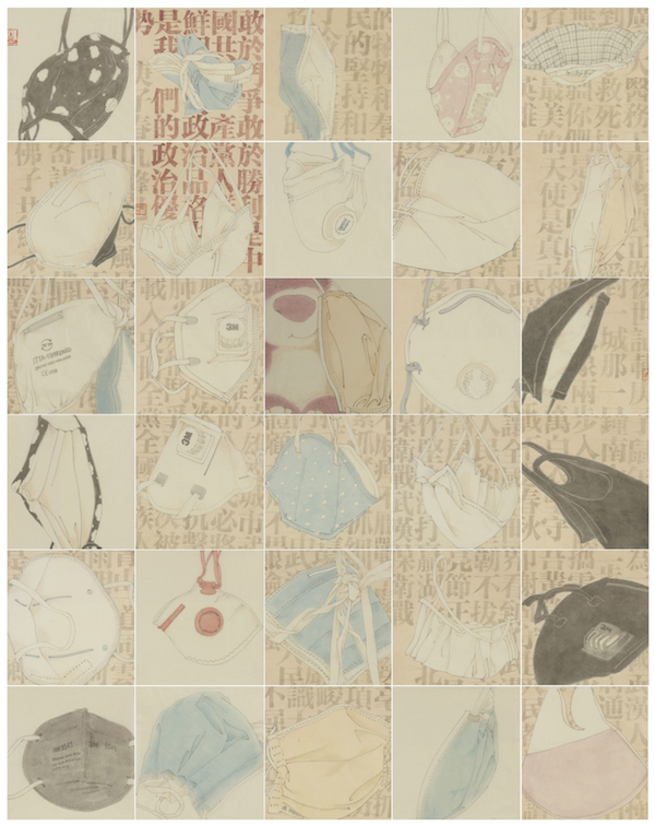 而在藝術(shù)創(chuàng)作中,一些同一主題的小幅作品也常常可以構(gòu)成大的創(chuàng)作。其中年輕畫家徐旭峰的作品《同舟共濟》就屬于這一類型,作者以30件小作品,呈現(xiàn)了三十只口罩的日常狀態(tài),他的創(chuàng)作靈感來自朋友們每天使用的不同類型的口罩,而背景的字則主要來自各方的寄語。