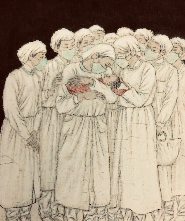 在此次疫情期間,也涌現(xiàn)出大量醫(yī)護人員題材的作品。如何畫出自己的語言,畫出自己的真誠對藝術(shù)家來說并不容易,但老藝術(shù)家的作品或許有些啟發(fā),70多歲的藝術(shù)家陳家泠每日觀看新聞,了解前方動態(tài),他通過中國畫的方式結(jié)合電腦合成,跨界創(chuàng)作。盡管在層層包裹的防護服內(nèi),但畫面中醫(yī)生溫柔的眼神帶給病人最大的安慰和信心。油畫家邱瑞敏在面部只露出雙眼的情況下,將畫面的重點放在醫(yī)護人員防護服的處理上,用筆概括果斷,用色大膽,帶著一種果斷、堅決和責(zé)任。