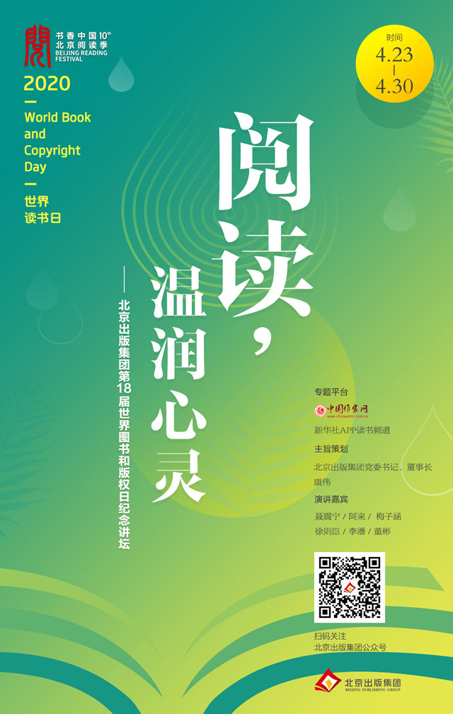 2020年“世界圖書(shū)和版權(quán)日”,北京出版集團(tuán)推出“閱讀,溫潤(rùn)心靈——北京出版集團(tuán)第18屆世界圖書(shū)和版權(quán)日紀(jì)念講壇”,以閱讀的方式,在文化與科技高度融合發(fā)展的5G時(shí)代中,履行出版企業(yè)的文化使命和責(zé)任擔(dān)當(dāng),廣邀名家學(xué)者相約線(xiàn)上閱讀分享,共品書(shū)香,共話(huà)人生。希望書(shū)香里的安靜篤定能傳遞給人們溫暖與力量,驅(qū)散陰霾、燭照人心。