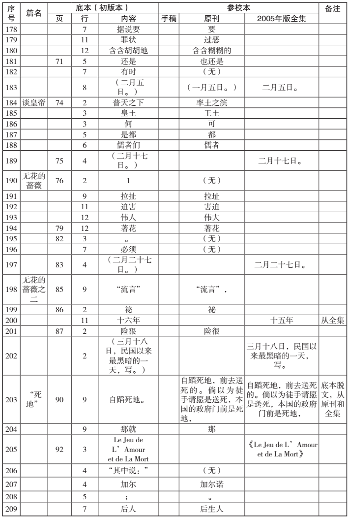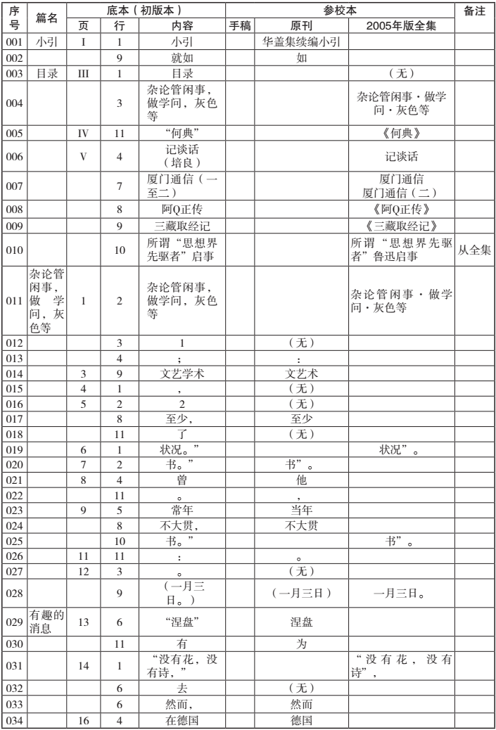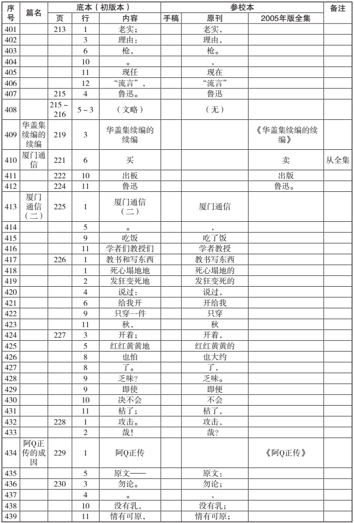 如此就完成了第一遍匯校工作。第二遍則參考現(xiàn)有??背晒槁┭a缺。重點是對照孫用先生《魯迅全集校讀記》(1982年版)中的《〈華蓋集續(xù)編〉校讀記》,以及自2005年版《魯迅全集》出版以來學界公開發(fā)表的校勘成果中所有與《華蓋集續(xù)編》有關(guān)的部分,對相關(guān)文本進行復(fù)核,確認個人失校的案例,將其補充進匯校表,以使工作相對完善。