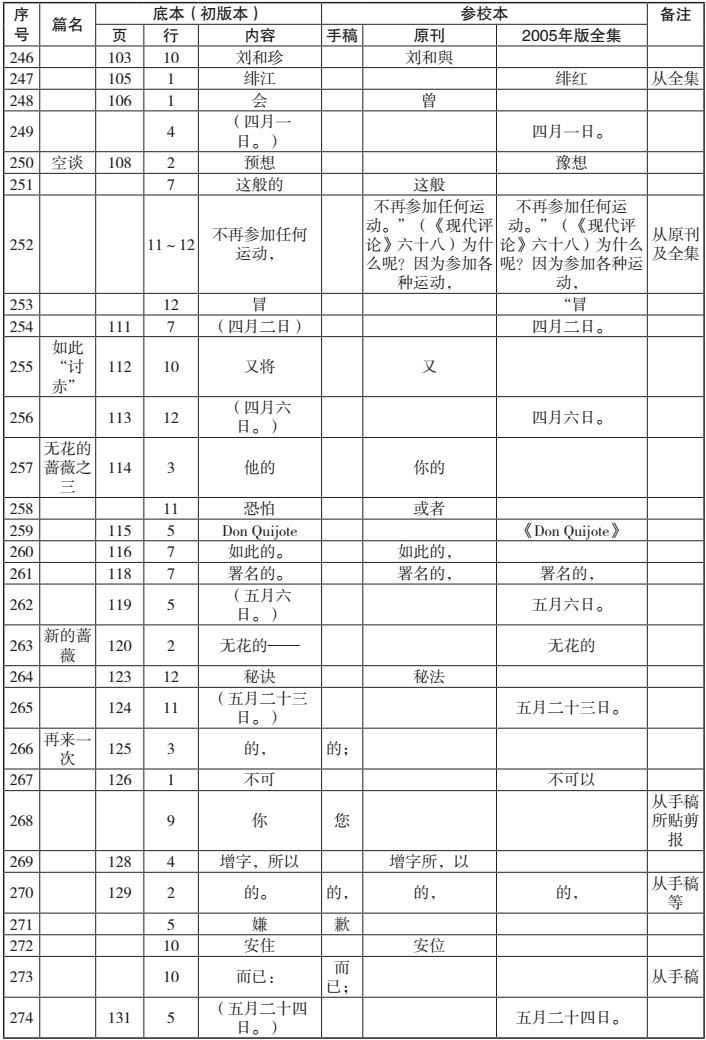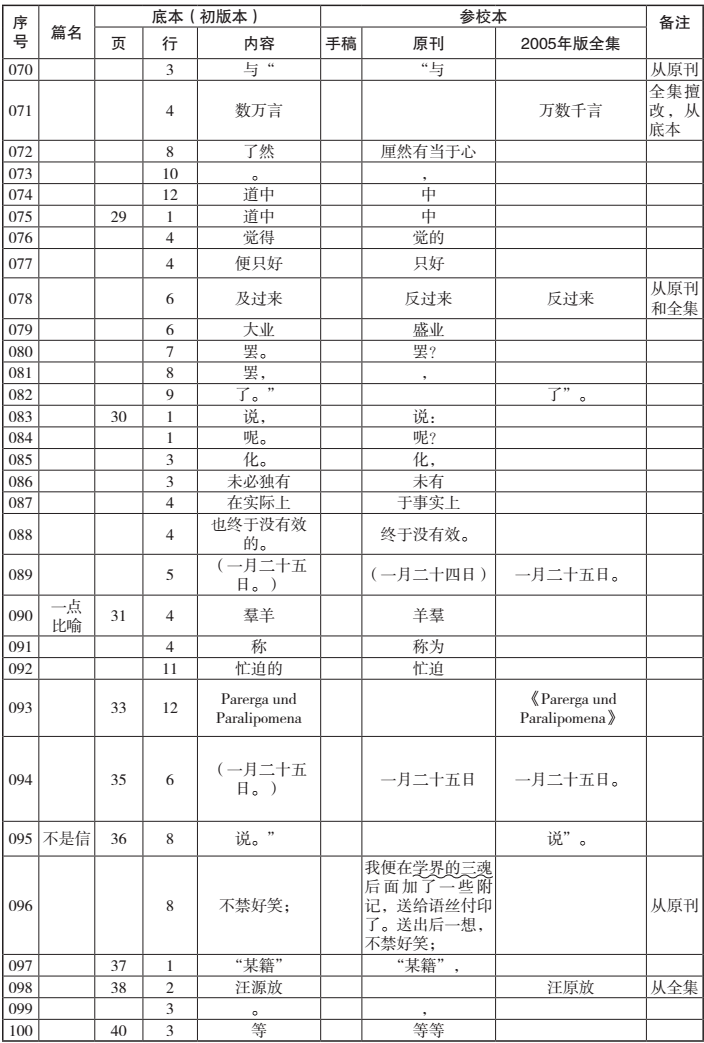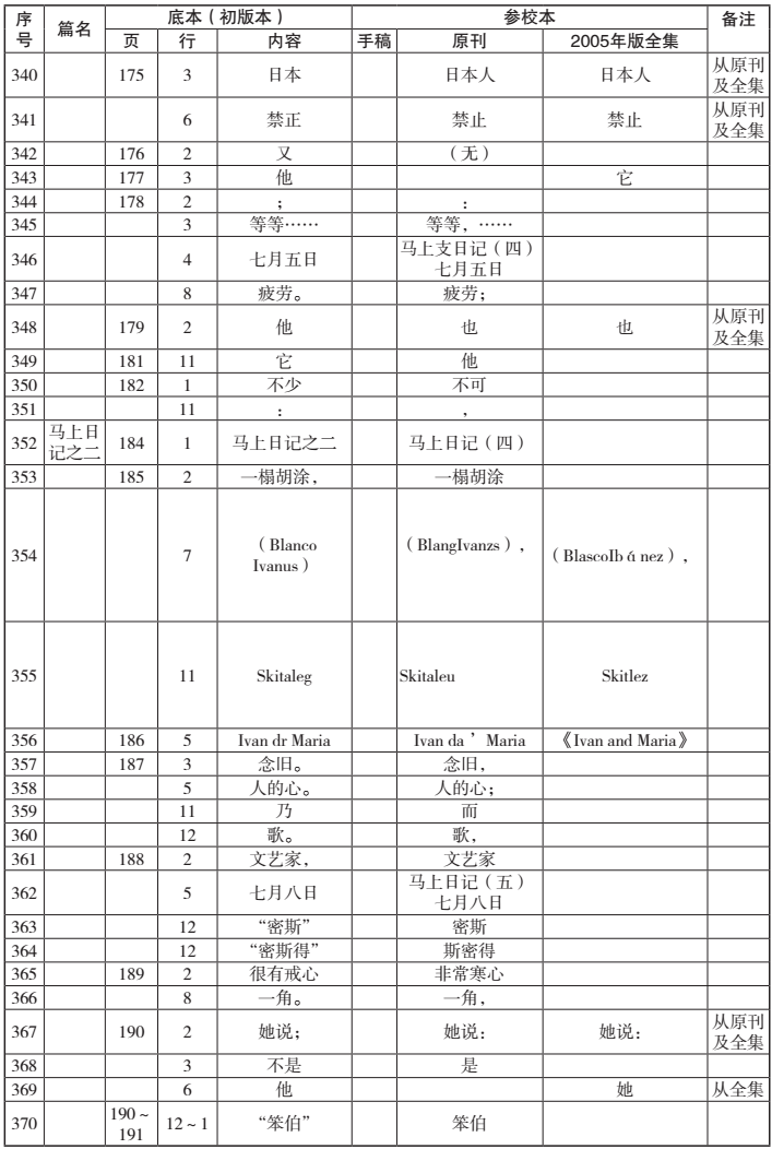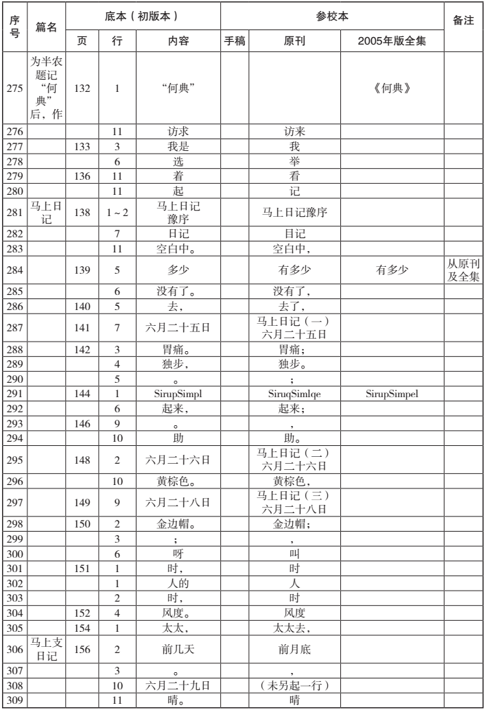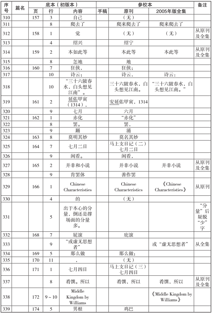 在決定專心從事此項匯校工作之后,因為用于匯校的底本(影印本)、手稿(影印本)與全集筆者早已收藏,因此在資料方面只余下原刊的搜求匯集。得益于近年來舊書刊被大規(guī)模掃描和收入網(wǎng)絡(luò)數(shù)據(jù)庫的利好以及學友的幫助,這項工作在短短幾天內(nèi)即基本完成。[vii]接下來在進行具體匯校時,為了讓自己沉下心來,全神貫注,我決定先不參考任何前賢成果,空無依傍,對文本進行“素讀”,以保證能最大限度地發(fā)現(xiàn)各版的差異之處。由于手稿嚴重不全,全集差錯很少,因此我把重點放在原刊和初版本的對勘上,逐字逐句進行。在對勘過程中發(fā)現(xiàn)兩者有任何差異,無論是文字還是標點,都及時記錄并填入?yún)R校表中。將原刊和初版本對勘完成后,再按同樣的程序,將初版本和全集進行對勘。此后,再將手稿和初版本進行對勘。當然,這只是工作的一般程序。實際過程中,遇有疑難處,需要各版互校,也常出現(xiàn)將所有版本擺滿案頭的情形。