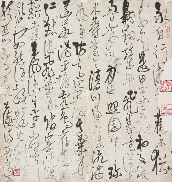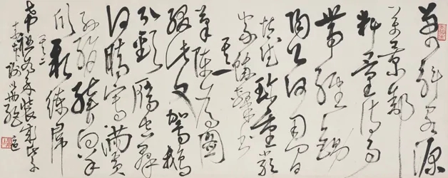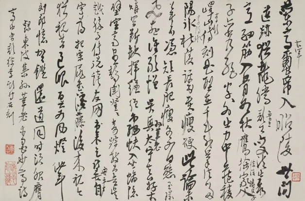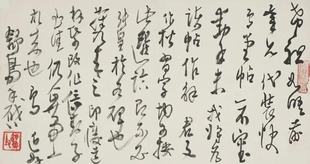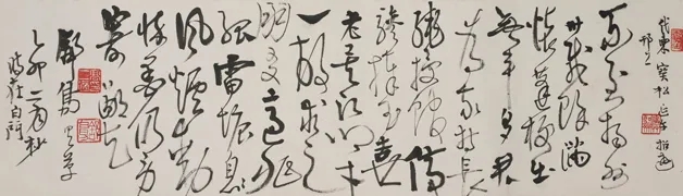 靜靜凝視高二適的書法遺墨,那靈異的墨線,似高猿悲叫,亂水潛奔,這是流淌在古典詩文和經(jīng)典碑帖中的心靈對晤,是意與古會的神異契合。在筆力彌滿、意態(tài)天矯,行氣淋漓的筆勢中透映出一位傳統(tǒng)文人的自我風(fēng)神。從“赴速急就稱奇觚,鬼哭神驚運(yùn)思初”的詩句里,流露出他作書時“筆所未到氣已吐”的豪邁心象。高二適的書法意象以氣勢開張、書蘊(yùn)“詩意”為基調(diào),以其精湛的筆墨古法、深厚淵深的文史修養(yǎng)和特立高潔的文人風(fēng)骨幻化熔鑄,開古典主義之新境,堪稱傳統(tǒng)書法草書一脈的浪漫主義大師。