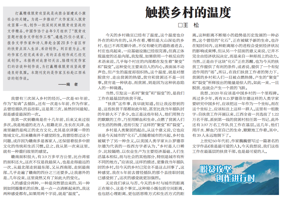 3月6日,《文藝報》頭版刊發(fā)王松赴江西采訪的創(chuàng)作談《觸摸鄉(xiāng)村的溫度》