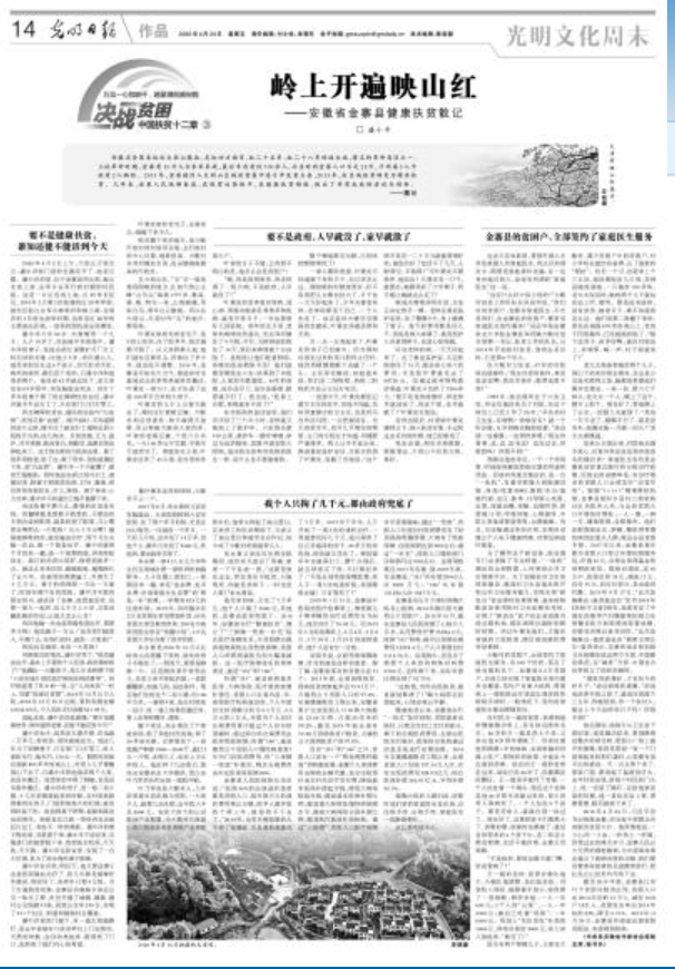 2020年4月24日,《光明日報》整版刊發(fā)潘小平作品《嶺上開遍映山紅——金寨縣健康扶貧散記》