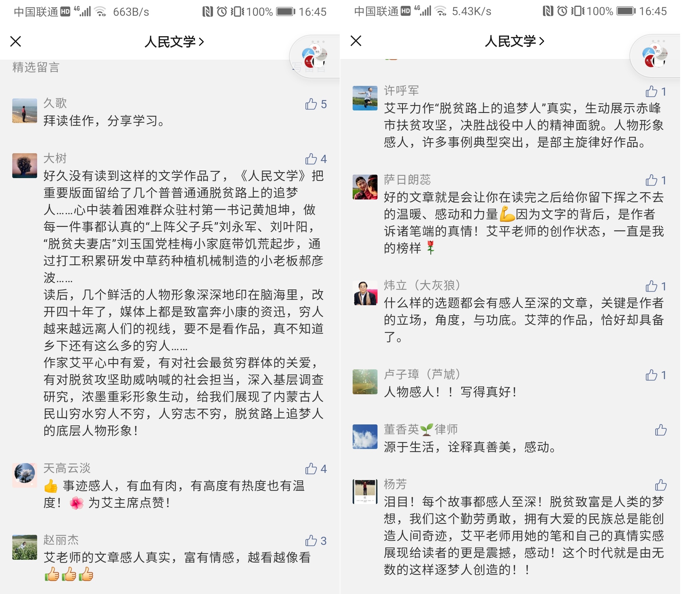 “人民文學(xué)”微信公眾號推出艾平《脫貧路上追夢人》后的網(wǎng)友留言