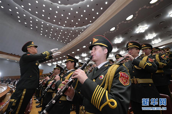 5月28日,第十三屆全國人民代表大會第三次會議在北京人民大會堂舉行閉幕會。這是軍樂團在演奏。 新華社記者 李賀 攝