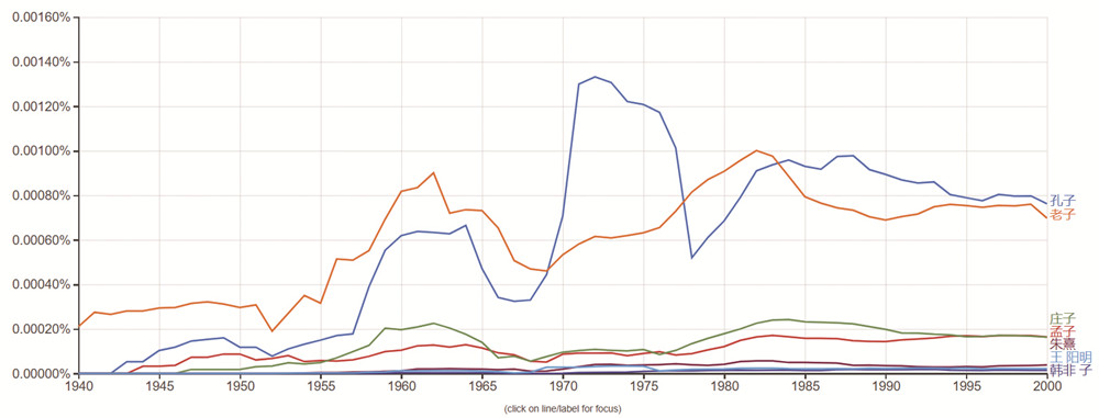 谷歌是人工智能領域的領頭羊,而谷歌圖書中收錄的大量書籍,谷歌搜索中存在的大量網(wǎng)頁文字數(shù)據(jù),以及谷歌學術中的學術文字記錄,都為構建這樣一個龐大的語料庫有所助益。它出品的在線工具“Google Ngram viewer”主要基于谷歌圖書的語料庫,方便展現(xiàn)不同語詞在歷史上的整體變化。通過輸入想要查找的關鍵詞,便可以看到在相關語料中,隨著歷史發(fā)展,相關詞語的變化趨勢。例如,筆者將時間限定為1940-2000年,鍵入孔子、孟子、老子、莊子、朱熹等中國歷代思想家,可以發(fā)現(xiàn),它們歷年在數(shù)據(jù)庫中的權重變化,這一數(shù)據(jù)顯示,孔子無疑是最有熱度的思想家,與學者和相關論者的思想勾連也最為密切。