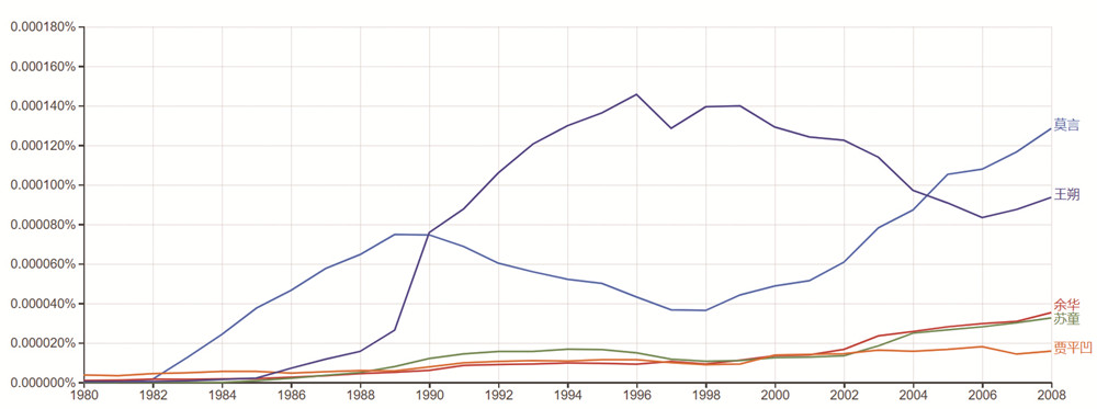 再如,可以選取幾位當代作家,如莫言、余華、王朔,觀察自1980年代以來,在紙質書數(shù)據(jù)庫中他們的權重走勢。
