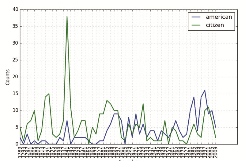 在官方相關示例中,一些獨特的研究結果已經(jīng)被呈現(xiàn)出來,例如,在不同時代的美國總統(tǒng)演講中,總統(tǒng)想強調(diào)的重點自然不同,那么“citizen”和“american”兩詞的使用頻率有什么變化?有關研究人員對其進行了一種可視化呈現(xiàn)。