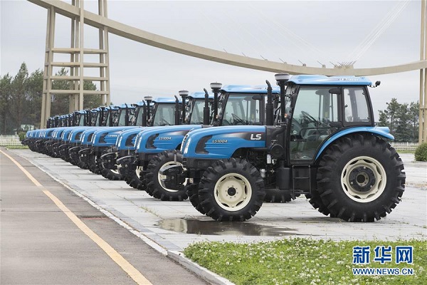 在北大荒精準(zhǔn)農(nóng)業(yè)農(nóng)機(jī)中心廣場上展示的大型農(nóng)機(jī)(6月15日攝)。新華社發(fā)(張濤 攝)