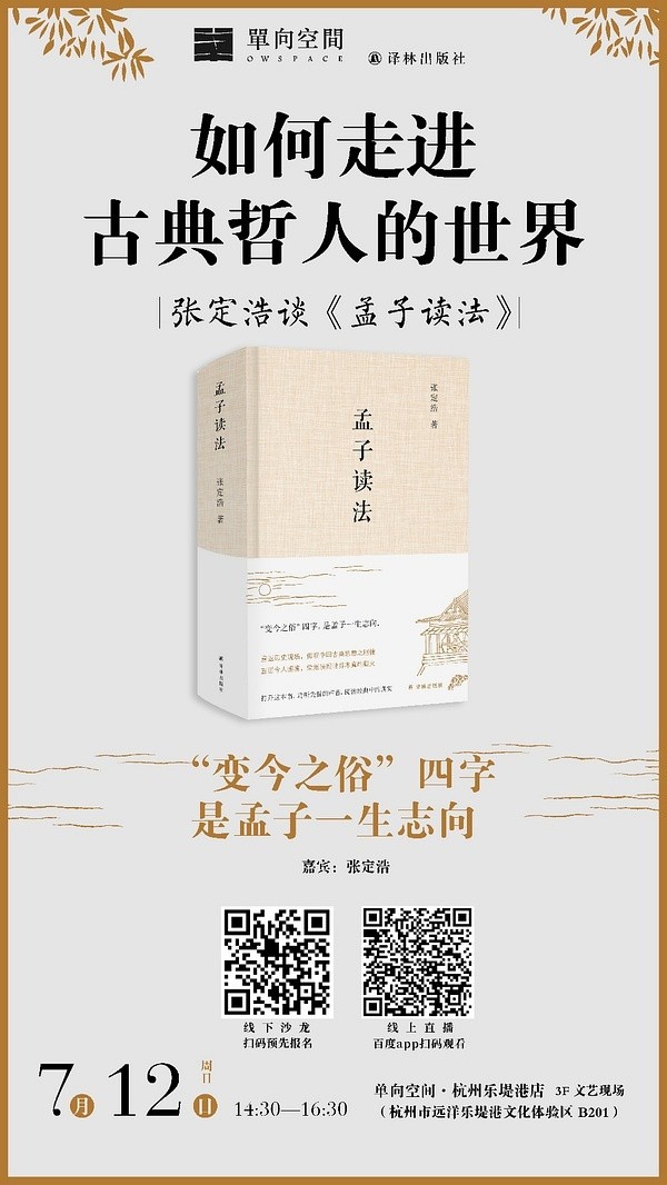 7月12日,張定浩帶著他的新書來到杭州,做客單向空間·杭州樂堤港店,與讀者分享自己對《孟子》及孟子其人的認(rèn)識。張定浩說,《孟子讀法》出版后一直未在上海做活動,此次特地在杭州舉辦第一場分享活動再次說明了他與杭州的緣分,早在《孟子讀法》之前,張定浩已經(jīng)寫過一本叫“孟子選讀”的小書,這本書正是由杭州出版社出版的。