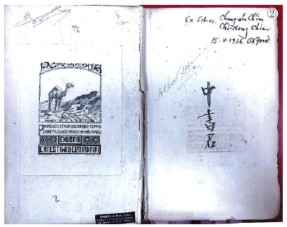 根據(jù)《品藻集》的精裝環(huán)襯頁上所貼的藏書票和書店標簽,以及扉頁上的題署來看(圖②),這是錢鍾書1936年5月15日在牛津?qū)捊郑˙road Street)27號的“帕克爾父子公司”(Parker&Son.Ltd.)購得的二手書,這個公司在當時已是一家百年老書店,后來又經(jīng)擴建和重建。這本書原來的主人名叫Ernest William Adair,生平不詳。但是書里的鉛筆批注顯然都是我們熟悉的錢鍾書字跡。