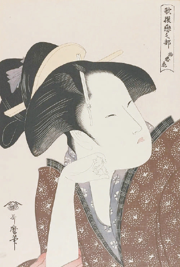 通俗美中繞不開的話題便是美人。在浮世繪畫家中,喜多川歌麿以描繪美人見長,著名的作品有《婦人相學十體》和《青樓美女》,其作品《歌撰戀之部·物思戀》表現(xiàn)的就是美人在戀愛中思念愛人的狀態(tài)。