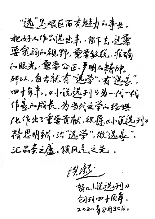 鐵凝賀《小說(shuō)選刊》創(chuàng)刊四十周年