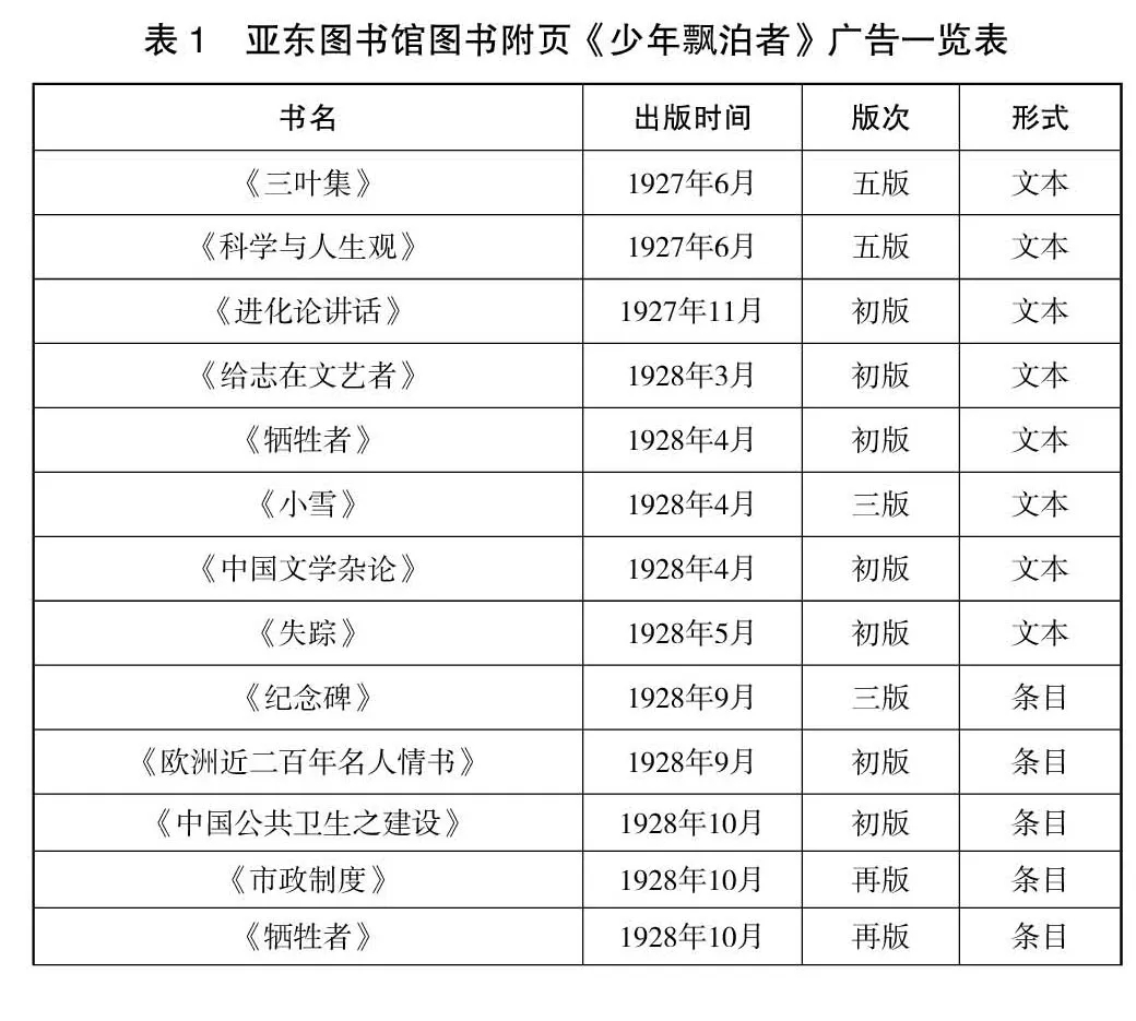 與《申報(bào)》上的廣告呈現(xiàn)出周期性不同,亞東圖書館在圖書附頁上為《少年飄泊者》所做的廣告,在時(shí)間分布上較為密集。“中國歷史文獻(xiàn)總庫·民國圖書數(shù)據(jù)庫”所收錄亞東圖書館出版的附有《少年飄泊者》廣告的圖書有35種,其中1927年3種,1928年14種,1929年13種,1930年1種,1931年1種,1934年2種,1936年1種,從年份分布來看,自《少年飄泊者》出版后到全面抗戰(zhàn)爆發(fā)前的十年間,一直在持續(xù)不斷。與前兩種廣告媒介相比,圖書附頁廣告時(shí)間覆蓋面更為廣泛。此外,《亞東圖書館書目》放在門市由讀者隨取隨閱,函索即寄,廣告時(shí)間更為自由,《少年飄泊者》是其宣傳的重點(diǎn)圖書。