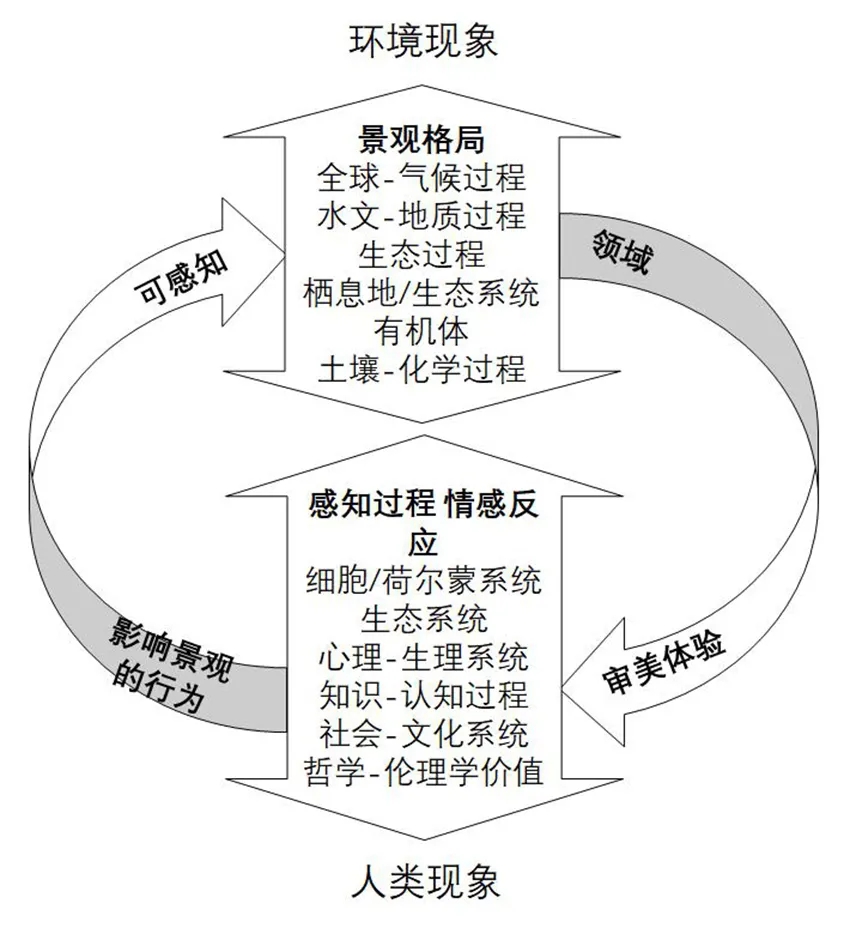 如圖2所示,美學與生態(tài)學在可感知領域(perceptible realm)聯(lián)結,在這個領域內,“景觀的諸種格局(patterns)是相互關聯(lián)又相互依存的環(huán)境現(xiàn)象的可感知實例(instantiations)”。人與景觀是互動的,人從景觀中獲得審美體驗,進而會改變其行為;而人的行為又會改變景觀,景觀的改變最終會影響人類自身,這種影響既包括精神層面的,也包括身體層面的。