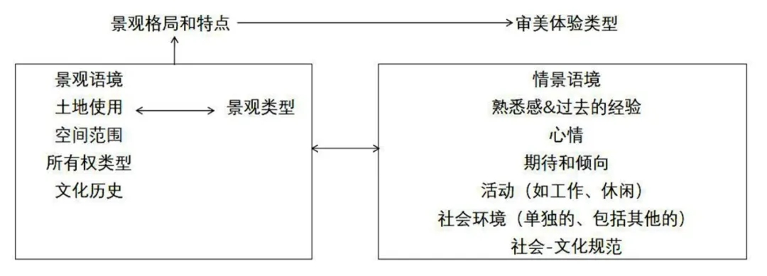 如圖2所示,審美體驗在可感知領域內的景觀格局中產(chǎn)生,而景觀語境和情境語境(situational context)以圖3所示的方式影響審美體驗。景觀類型依據(jù)土地使用、空間范圍、所有權類型和文化歷史進行劃分,不同類型的景觀會產(chǎn)生不同的格局和特點,進而產(chǎn)生不同的審美體驗。情境語境對審美體驗的影響體現(xiàn)在個人和社會兩方面,前者包括熟悉感和過去的經(jīng)驗、心情、期待和傾向、活動,后者包括社會環(huán)境和社會—文化規(guī)范。這些因素會構成不同的情境,同一個人如果身處不同情境,即使面對同一景觀,也會產(chǎn)生不同的感知,進而產(chǎn)生不同的審美體驗。此外,景觀語境與情境語境之間也存在相互作用:一方面,特定的景觀類型要求觀察者持有相應意圖,這會影響人們在感知景觀時的社會規(guī)范與個人期待;另一方面,觀察者的意圖不同,他所秉持的社會規(guī)范與個人期待也就不同,這些規(guī)范和期待會影響不同類型的景觀中可感知到的特點。