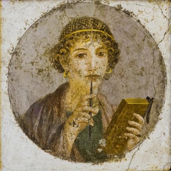 出土于龐貝古城的古希臘女詩(shī)人薩福肖像,她手持一本四頁(yè)蠟板和一支鐵筆