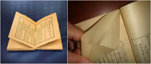 第二種書(shū)頁(yè)較薄,紙張只有一面有字,沒(méi)有字的一面對(duì)折,若干頁(yè)對(duì)折之后縫在一起, 加上封面紙,打三眼訂線。這種裝訂方式文字內(nèi)容連貫,即使縫線斷開(kāi),也能方便地找到書(shū)頁(yè)的正確次序。后來(lái)的線裝書(shū)也是采用這樣單面書(shū)寫(xiě)印刷,無(wú)字一面朝內(nèi),有字一面朝外的對(duì)折方式。