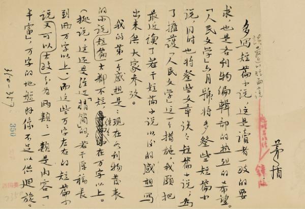 茅盾這封信,我們這輩人也應該是非常熟悉的,只要涉及到當代文學研究,這封信是繞不過去的。一是這篇文章繞不過去,二是文章里面提到的那些作品,很多已經(jīng)成為了當代文學的經(jīng)典之作,也是繞不過去的。《談最近的短篇小說》這篇文章完稿日期是1958年5月12日,是應《人民文學》編輯部的邀請寫的,茅盾也寫過很多短篇小說,他也是很樂意評論的。 我們對作家進行研究,非常重要的一點,就是他的文本研究,特別是在今天來講是越來越重視了。近現(xiàn)代的版本,我個人認為遠遠比古籍復雜,這里面的版本變化各種各樣,有作者自己的反復修改,像老舍的《駱駝祥子》等不知道出過多少版本,也有當時的情況下比如說被鎮(zhèn)壓的,被銷毀的,被查禁的,還有政治形勢下需要進行某種修改,所以非常復雜,出現(xiàn)了很多版本。我也希望對以后文學的研究,加強對文本的研究。