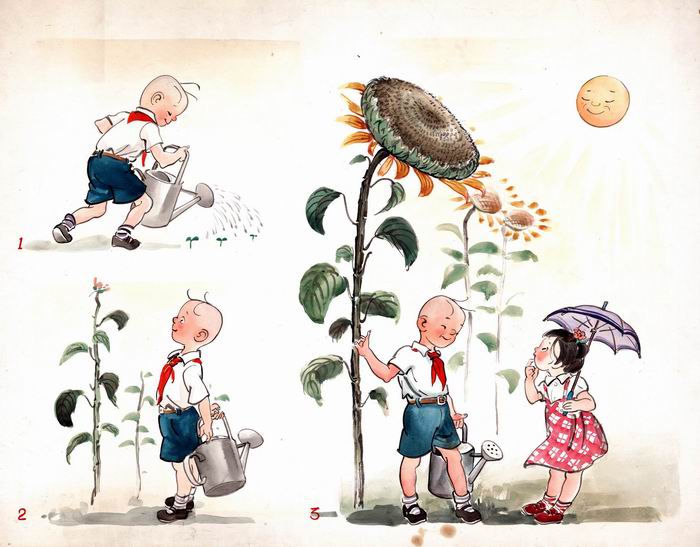 1949年初,宋慶齡創(chuàng)辦的中國福利基金會為救助流浪兒童,計劃與我父親一起舉辦一個關(guān)于三毛的義賣和展覽,并接受捐款成立“三毛樂園”專門幫助流浪兒童,讓他們有飯吃、有地方住、有書讀。1949年4月4日(當(dāng)時的兒童節(jié)),在上海南京路大新公司(今市百一店)舉辦了一次展覽,我父親畫了30幅三毛的水彩畫進(jìn)行義賣,當(dāng)時30幅作品全部售完,最高的一幅是一位外國記者以800美元拍下,當(dāng)時800美元是一筆很大的數(shù)目。展覽中上海商會的會長還主持舉行了募捐,所獲款項后來全部用于辦“三毛樂園”,這在當(dāng)時也是一次有很大影響的慈善募捐的活動。