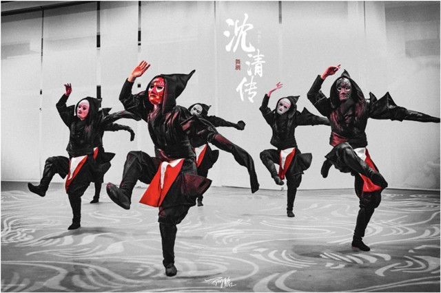 據(jù)本劇的總編導之一柯書劍介紹,在舞蹈設計編排上,巨幅折扇的運用,是作為環(huán)境移變與劇情轉(zhuǎn)折的提示點和強化點。那么,折扇不僅僅是演員手中的一個道具,更是融入到劇情當中的一個重要角色,承擔起了強化舞臺空間與劇情演變的功能。比如,當寫有“祭” 字的折扇出現(xiàn)時,提示進入沈清要在祭祀儀式中被投入海中的重要情節(jié),瞬間調(diào)動觀眾情緒,扣人心弦。