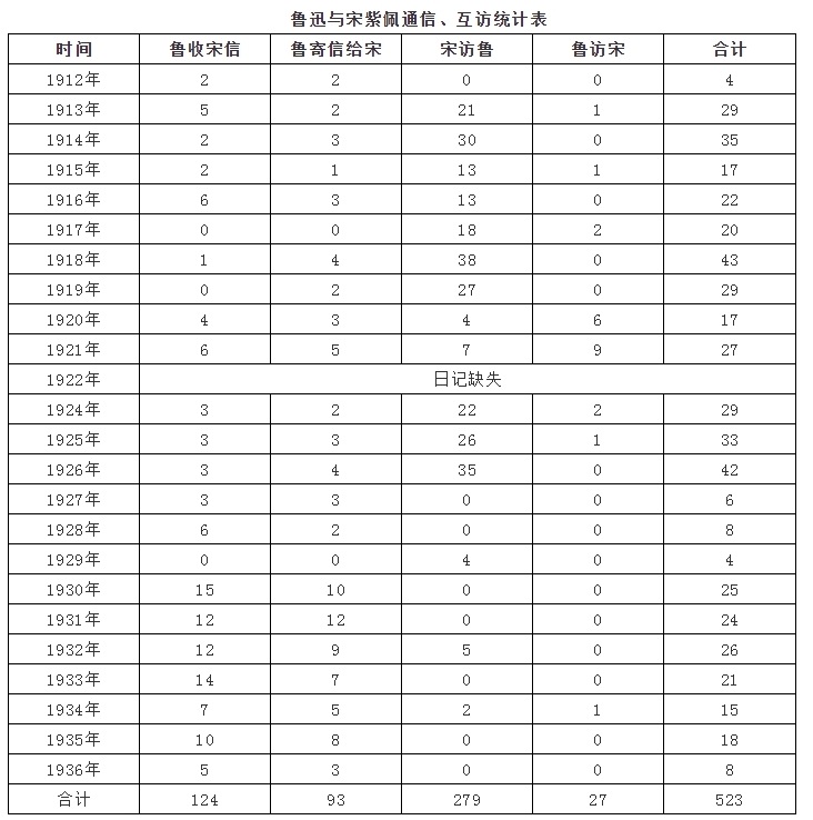 在魯迅的朋友中,有兩位可以稱得上是終生摯友,一位是許壽裳,另一位是宋紫佩。學(xué)界對魯迅與許壽裳兩人關(guān)系有持續(xù)深入的探討,但對魯迅與宋紫佩關(guān)系的探討頗為冷清。作為魯迅的同鄉(xiāng),宋紫佩曾經(jīng)是魯迅的學(xué)生,后來又與魯迅成為同事和摯友。從1909年相識到1936年魯迅去世,兩人的聯(lián)系一直未曾間斷,魯迅在杭州、紹興、北京、廈門、廣州、上海時均與宋紫佩保持聯(lián)系。即使在魯迅去世以后,宋紫佩與魯迅親友之間也依然保持著聯(lián)系。據(jù)筆者統(tǒng)計(jì),魯迅現(xiàn)存的日記(因魯迅1922年日記缺失)中提及宋紫佩的次數(shù)多達(dá)599次(魯迅親友的回憶中也多次提到宋紫佩)。從1912年至1936年間,宋紫佩寫給魯迅信121封,魯迅寫給宋紫佩信81封。宋紫佩拜訪魯迅280次,魯迅拜訪宋紫佩27次。具體可見下表: