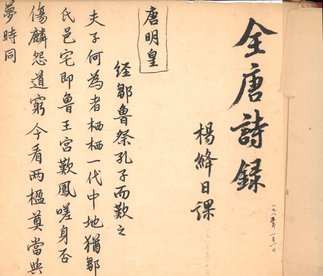 《全唐詩錄》稿本第一冊首頁。錢先生選詩中也不乏有帝王詩作,包括唐玄宗、唐宣宗、武則天等人作品,但其選詩也重在表現(xiàn)作者真誠的情緒,如圖中這首《經(jīng)鄒魯祭孔子而嘆之》,表達了唐玄宗李隆基對夫子的同情與嘆惋之情。