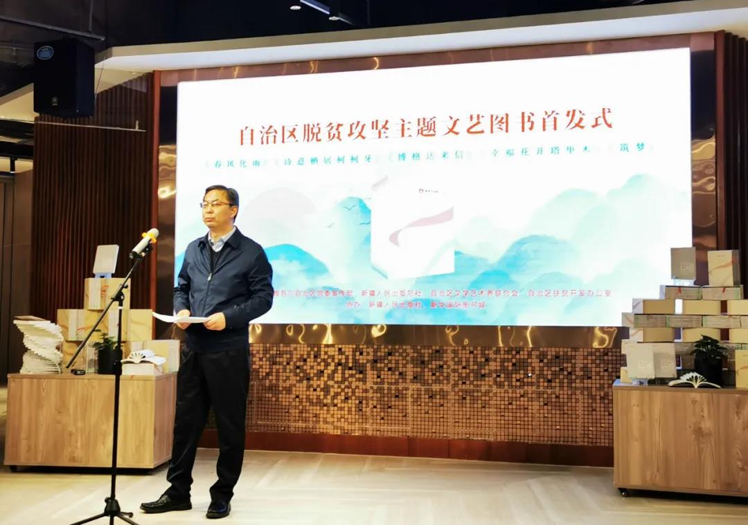 2020年12月4日,新疆脫貧攻堅主題文藝圖書首發(fā)儀式在烏魯木齊新華國際圖書城舉行。新疆維吾爾自治區(qū)黨委宣傳部副部長任彥賓、新疆維吾爾自治區(qū)扶貧辦一級巡視員陳雷、新疆人民出版總社黨委副書記、副總編輯范聰卓、新疆維吾爾自治區(qū)黨委宣傳部文藝處處長張?zhí)?、新疆維吾爾自治區(qū)扶貧辦脫貧攻堅督查專員張代茂、新疆人民出版總社出版編務(wù)部部長羅衛(wèi)華,以及自治區(qū)黨委宣傳部機(jī)關(guān)團(tuán)委代表、自治區(qū)文聯(lián)代表、新疆人民出版總社代表,作家代表、譯者等參加首發(fā)儀式。新疆維吾爾自治區(qū)文聯(lián)黨組成員、秘書長、新疆作家協(xié)會副主席熊紅久主持首發(fā)儀式。