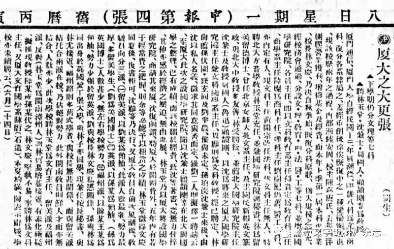 1926年夏天,魯迅經(jīng)林語堂介紹,決定離京南下,前往廈門大學(xué)教書。這一想法大約在6月中旬確定下來。在6月17日給李秉中的信中,魯迅寫道:“直到現(xiàn)在,文章還是做,與其說‘文章’,倒不如說是‘罵’罷。但是我實在困倦極了,很想休息休息,今年秋天,也許要到別的地方去,地方還未定,大約是南邊。目的是:一,專門講書,少問別事(但這也難說,恐怕仍然要說話),二,弄幾文錢,以助家用,因為靠版稅究竟還不夠?!雹荻?dāng)廈門大學(xué)得知魯迅確定前來任教后,他的名字就常常出現(xiàn)在與學(xué)校有關(guān)的報道中。如6月24日《申報》第10版“教育消息”欄登載《專電》,稱“廈大下學(xué)期改分文、理、商、教、法、醫(yī)、工教育七科,增設(shè)國學(xué)研究院,聘北大教授林玉堂為文科主任兼研究院總秘書,沈兼士為研究院主任兼文科國學(xué)系主任,周樹人、顧頡剛為教授,又?jǐn)M聘錢玄同或劉半農(nóng),余各科多原各系主任繼”。6月28日“教育消息”欄又刊登了一篇更為詳細(xì)的通訊: