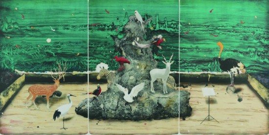 因?yàn)槊舾?,觀(guān)念是新穎的。人類(lèi)用雙腿動(dòng)作行走,用頭腦判斷思考,用觀(guān)念將這兩者結(jié)合,版畫(huà)也是在行為與思想并行中形成觀(guān)念,從手段與工具的觀(guān)念,逐漸過(guò)渡到結(jié)果與目的觀(guān)念,而每一次觀(guān)念的完成都依賴(lài)作品的成熟,就像每一次觀(guān)念的造端都仰仗畫(huà)家的不成熟,只有不成熟的觀(guān)念才是敏感的,才充滿(mǎn)了青春的銳氣。徐娜的木口木刻作品《青山綠水》《天之四靈》系列,用一貫的縝密鋪排著新觀(guān)念的天羅地網(wǎng),她要捕捉的除了現(xiàn)實(shí)的回音,還關(guān)乎歷史的遺韻,在過(guò)去與未來(lái)之間建構(gòu)自己認(rèn)識(shí)的邏輯。姚元魯?shù)乃∧景孀髌贰兜麎?mèng)“白黑”》《蝶夢(mèng)“西東”》則以光影的律動(dòng)強(qiáng)化了虛無(wú)的實(shí)在,畫(huà)面中縱橫伸展的空間彌漫著神秘的夢(mèng)魘。朱柯橙的銅版作品《The shape Between Uslll》在漫無(wú)邊際的散淡中拾撿日常的瑣碎,都是在新的觀(guān)念的探索中尋找立足之點(diǎn),趙子亮的絲網(wǎng)版畫(huà)《五號(hào)線(xiàn)的日常》系列與劉海辰的銅版作品《失志與成輝》是從完全不同的立場(chǎng)闡述著相似的疑問(wèn),匆匆而去的日常,究竟體現(xiàn)了怎樣的意義,有形或無(wú)形的生命如何面對(duì)逝去。以往人們習(xí)慣于在畫(huà)面中尋找答案,而新的觀(guān)念只提供了敏感,在新的感覺(jué)中,去體味被畫(huà)家擦拭一新的老問(wèn)題,去思考其中新的價(jià)值或意義,畫(huà)家正是通過(guò)自己的創(chuàng)作,透視出自然與社會(huì)的關(guān)系,從自然的角度認(rèn)識(shí)社會(huì),從社會(huì)的立場(chǎng)探究自然,是畫(huà)家以自己對(duì)觀(guān)念的敏感,串連起主體與客體,主觀(guān)與客觀(guān)之間的通道。