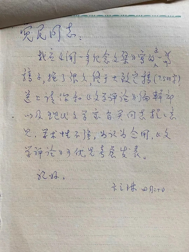 我應(yīng)《聞一多紀(jì)念文集》寫的這一篇稿子,拖了很久,終于大致定稿(7500字),送上請你和《文學(xué)評論》編輯部以及現(xiàn)代文學(xué)室有關(guān)同志提提意見,學(xué)術(shù)性不強(qiáng),如認(rèn)為合用,《文學(xué)評論》可優(yōu)先考慮發(fā)表。