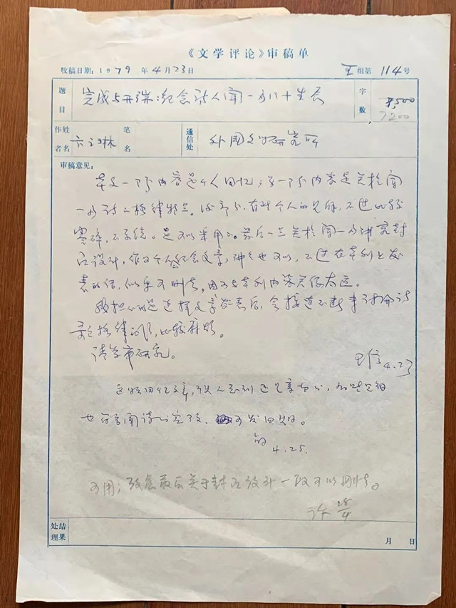 《文學(xué)評論》編輯部1979年4月23日收到卞之琳的稿件《完成與開端:紀(jì)念詩人聞一多八十生辰》,字?jǐn)?shù)7500。