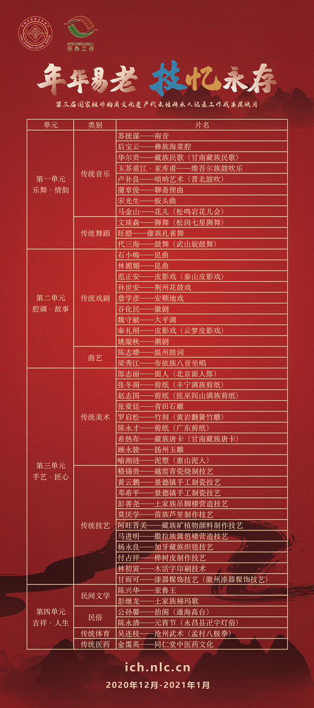 12月31日,隨著48部非遺紀(jì)錄片在國家圖書館中國記憶項(xiàng)目中心的非遺展映專區(qū)(ich.nlc.cn)上線,第三屆“年華易老,技?憶永存——國家級非物質(zhì)文化遺產(chǎn)代表性傳承人記錄工作成果展映月”正式拉開帷幕。