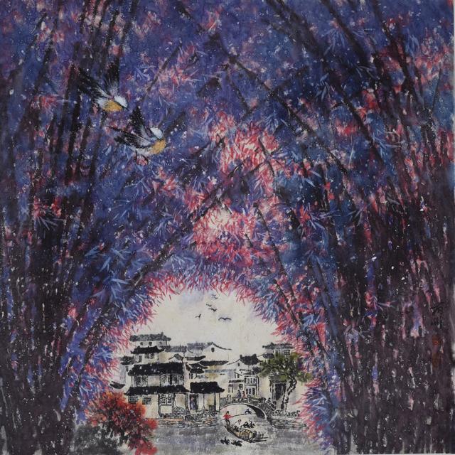 郭丙州中國(guó)畫參展作品《花溪紅濕處》 70cmx70cm