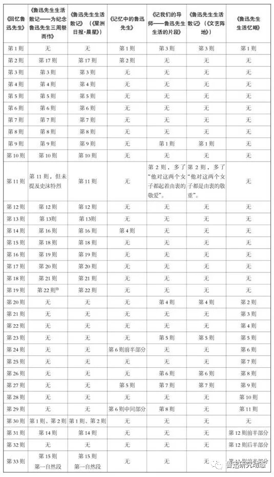 為更直觀地看出上述文章的關(guān)聯(lián)內(nèi)容及關(guān)聯(lián)程度,筆者將《回憶魯迅先生》的各則內(nèi)容與上述六篇文章進(jìn)行了比較,整理如下: