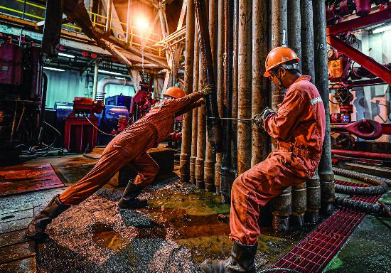 2020年7月26日,在位于南海北部海域的勘探三號鉆井平臺上,鉆井工人在擺放鉆桿。 蒲曉旭 攝
