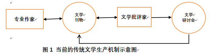 新的文學(xué)載體、新的傳播形式制造了新的生產(chǎn)機(jī)制,原來的傳統(tǒng)文學(xué)生產(chǎn)機(jī)制受到了擠壓和沖擊。首先是純文學(xué)的受眾即讀者的流失和青黃不接。一方面由于精神娛樂活動(dòng)范疇的驟然膨脹使原來純文學(xué)刊物的大部分受眾不再鐘愛于傳統(tǒng)的文學(xué)閱讀,轉(zhuǎn)而移情于其他更為輕松刺激和感官愉悅的娛樂活動(dòng);另一方面成長(zhǎng)于市場(chǎng)經(jīng)濟(jì)和消費(fèi)文化環(huán)境中的年輕一代對(duì)傳統(tǒng)的純文學(xué)缺乏心理和文化認(rèn)同,無法大量成為純文學(xué)的受眾和讀者。其次是原來的大部分業(yè)余作家,在傳統(tǒng)的文學(xué)生產(chǎn)機(jī)制里的上升通道受阻之后不再屬于傳統(tǒng)文學(xué)生產(chǎn)機(jī)制中的后備能量。第三是網(wǎng)絡(luò)文學(xué)的興起使得很多文學(xué)生產(chǎn)者主動(dòng)進(jìn)行了陣地轉(zhuǎn)移。第四是傳統(tǒng)文學(xué)機(jī)制自身系統(tǒng)的整體性固化,如圖1所示,時(shí)至今日,以作協(xié)、紙質(zhì)純文學(xué)期刊和專業(yè)作家為主體的傳統(tǒng)的文學(xué)生產(chǎn)機(jī)制大多仍然固守最初的模式,但其讀者和業(yè)余作家的廣大基礎(chǔ)早已不在,傳統(tǒng)的“純文學(xué)”成為了作家—刊物—批評(píng)家—研討會(huì)系統(tǒng)里的自寫、自評(píng)與自語。
