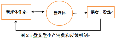 如果說網(wǎng)絡(luò)文學(xué)使得傳統(tǒng)純文學(xué)喪失了半壁江山,那自媒體及社會(huì)化媒體的普及則使得傳統(tǒng)的純文學(xué)生產(chǎn)完全成了學(xué)院和體制內(nèi)精英知識(shí)分子的“小圈子”的行為。自媒體及社會(huì)化媒體文學(xué)生產(chǎn)的本質(zhì)特點(diǎn)是“碎片性”,它由原來“資本看不見”的空間生產(chǎn)出來,并且在傳播和消費(fèi)的過程中悄然實(shí)現(xiàn)了碎片空間的再生產(chǎn),這種生產(chǎn)和傳播及消費(fèi)的形式在社會(huì)功能、審美特征方面都契合當(dāng)下社會(huì)的心理狀態(tài)和文化符碼,也恰恰是對(duì)信息碎片化的后工業(yè)時(shí)代的一個(gè)文學(xué)注解。雖然傳統(tǒng)型的專業(yè)作家和批評(píng)家、作協(xié)仍然依托政治、社會(huì)和文化資本掌握著主流的話語權(quán),可以在其話語系統(tǒng)里忽視或者“不承認(rèn)”微文學(xué)創(chuàng)作的文學(xué)意義,但傳統(tǒng)的文學(xué)生產(chǎn)機(jī)制在商業(yè)接受和受眾基礎(chǔ)的范疇上已經(jīng)逐漸被新的生產(chǎn)和消費(fèi)機(jī)制所取代。以自媒體和社會(huì)化媒體為代表的碎片化文學(xué)、微文學(xué)生產(chǎn)自問世起并非是以得到傳統(tǒng)純文學(xué)話語體系承認(rèn)為目的,碎片化文學(xué)生產(chǎn)在本質(zhì)上遵從的是商業(yè)資本和消費(fèi)主義的規(guī)則而不是傳統(tǒng)意義上的文學(xué)規(guī)則,它自有其自身的一套生產(chǎn)機(jī)制和遵循的邏輯。文學(xué)的意義固然不能僅用商業(yè)價(jià)值消費(fèi)邏輯來衡量,但傳統(tǒng)的文學(xué)生產(chǎn)逐漸失去受眾基礎(chǔ)和碎片化文學(xué)生產(chǎn)的蓬勃現(xiàn)狀卻是怎么都無法掩蓋的一個(gè)事實(shí)。微文學(xué)生產(chǎn)消費(fèi)和反饋機(jī)制如下圖所示。