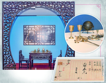①鴻運樓的餐桌座椅及餐具。②錦江飯店的各式金屬餐具。③1936年的杏花樓菜單。 均本報記者 邢千里攝 制圖:馮曉瑜