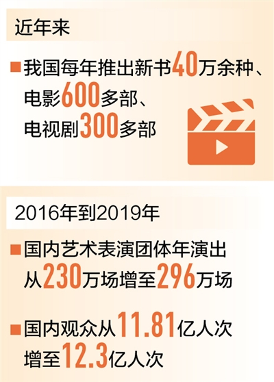 在作品質(zhì)量提升的同時(shí),我國(guó)文化產(chǎn)品的供給能力也在持續(xù)增強(qiáng)。目前我國(guó)每年推出新書(shū)40萬(wàn)余種、童書(shū)4萬(wàn)多種、電影600多部、電視劇300多部、動(dòng)漫400多部……眾多文化產(chǎn)品的生產(chǎn)規(guī)模位居世界前列。演出市場(chǎng)持續(xù)繁榮,2016年到2019年,國(guó)內(nèi)藝術(shù)表演團(tuán)體年演出場(chǎng)次從230萬(wàn)場(chǎng)增長(zhǎng)至296萬(wàn)場(chǎng),國(guó)內(nèi)觀眾從11.81億人次增加至12.3億人次,其中農(nóng)村觀眾超過(guò)7億人次。
