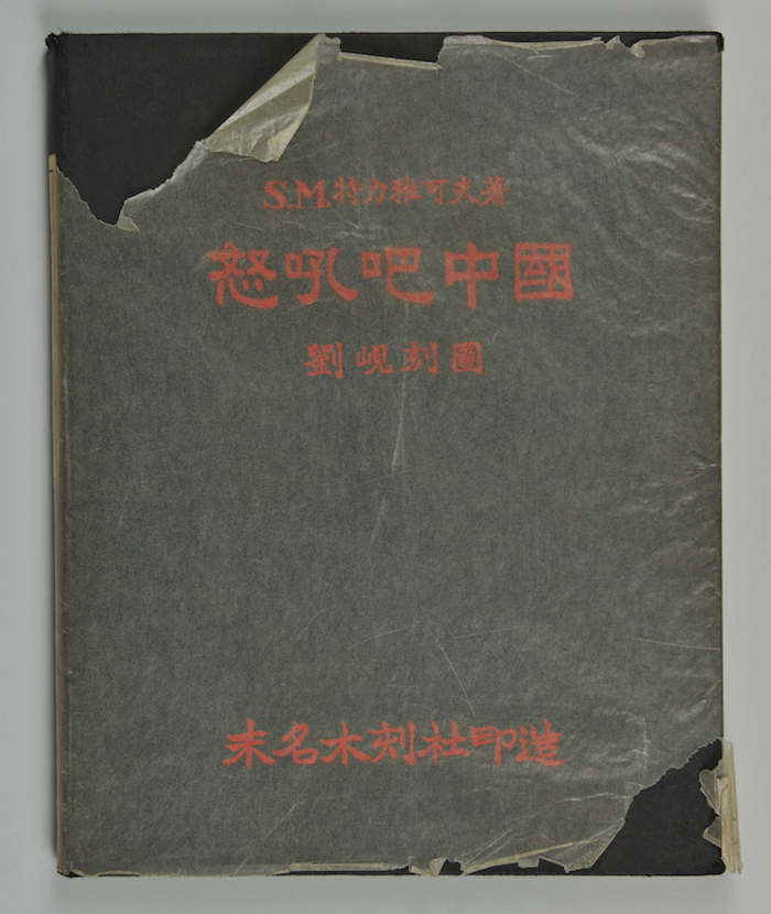 劉峴贈魯迅《怒吼吧中國之圖》簽名本,S.M.特力雅可夫著 劉峴作木刻插圖,書中有木刻作品28幅,1935年北京未名木刻社印造 初版,1935年劉峴曾贈送魯迅,書中題字“魯迅先生指正 峴敬贈” ,魯迅藏書 許廣平捐贈,北京魯迅博物館藏